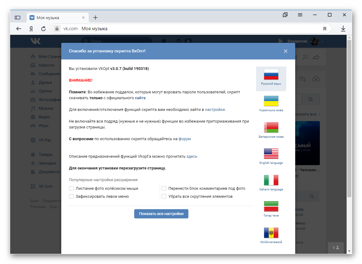 - Соглашаемся с установкой дополнения и переходим во ВКонтакте.