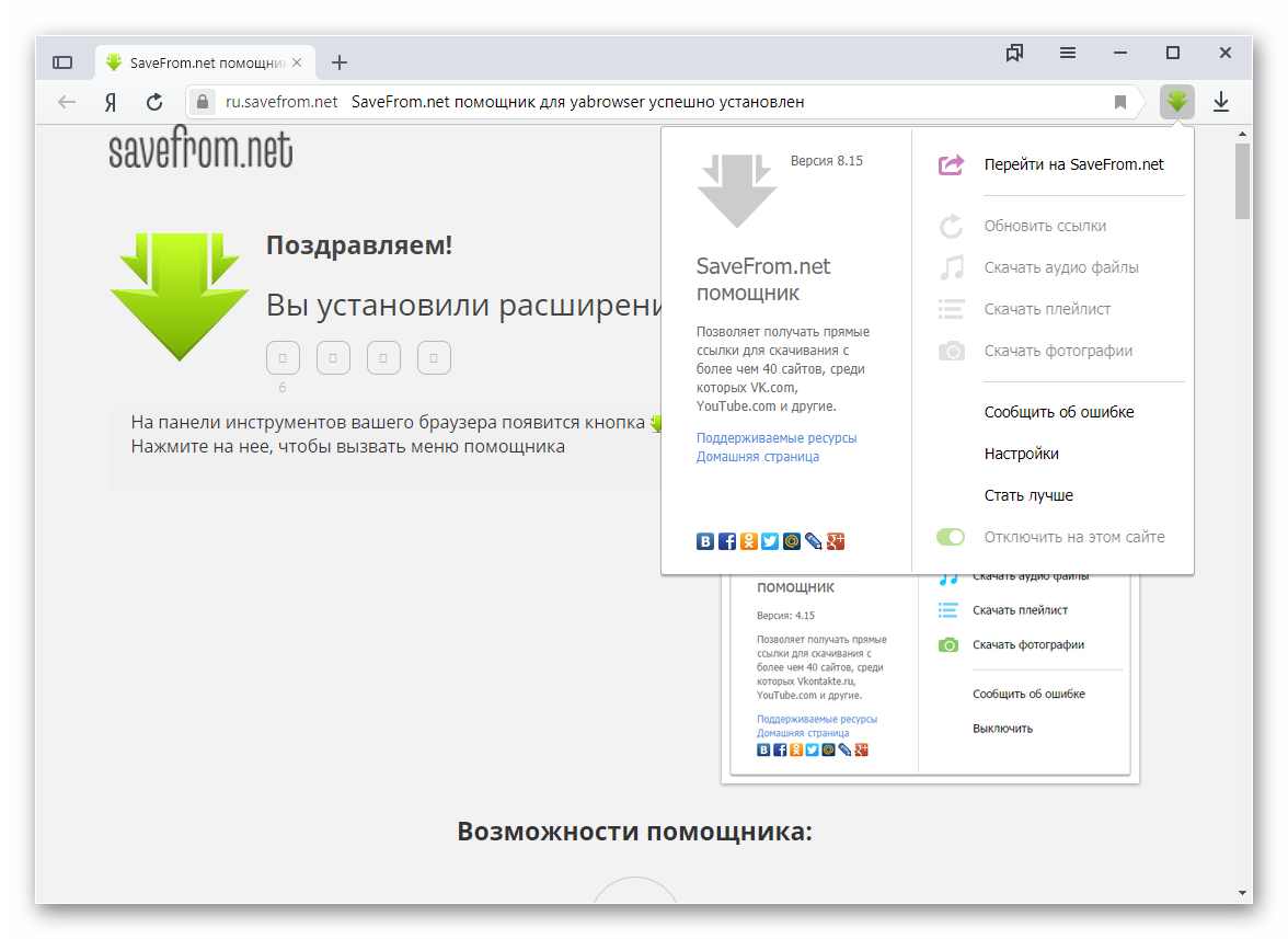 - также SaveFrom.net встраивается в браузер и работает в качестве расширения.