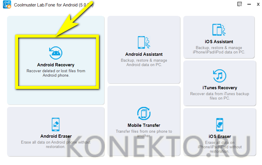 Скачать (ссылка — coolmuster.com), запустить программу и нажать на кнопку Android Recovery.