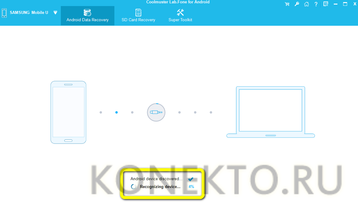 Подключить телефон с помощью USB-кабеля и подождать, пока приложение его опознает.