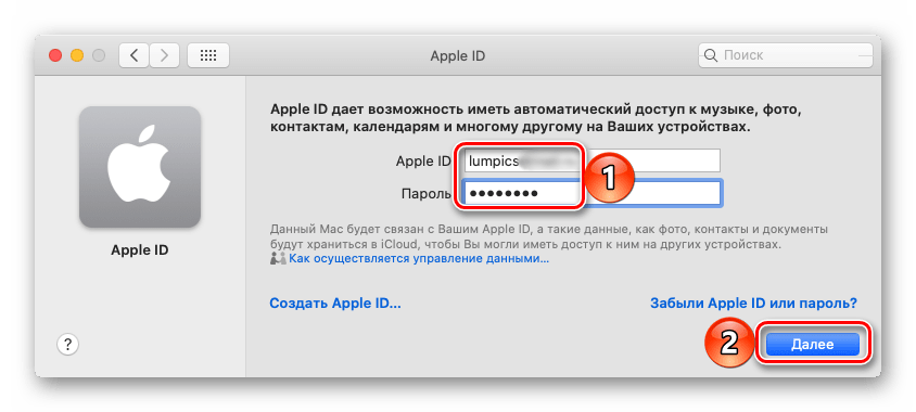 Далее, находясь во всем том же разделе «Системных настроек» — «Apple ID», — войдите в новую учетную запись, указав логин и пароль от нее и воспользовавшись кнопкой «Далее».