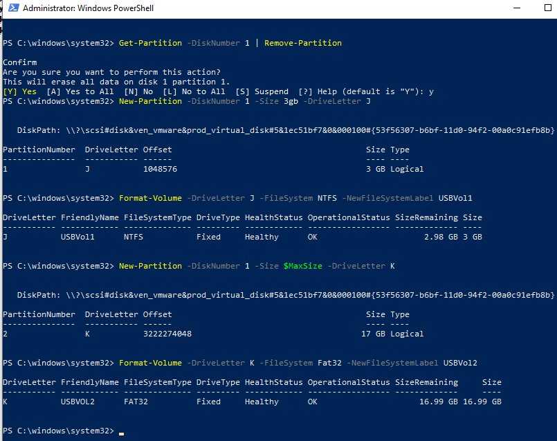 New-Partition –DiskNumber 1 -Size 3gb -DriveLetter JFormat-Volume -DriveLetter J -FileSystem NTFS -NewFileSystemLabel USBVol1New-Partition –DiskNumber 1 -Size $MaxSize -DriveLetter KFormat-Volume -DriveLetter K -FileSystem Fat32 -NewFileSystemLabel USBVol2