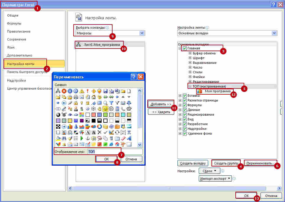 - Выбираете перенесённую кнопку макроса в группе «ТОП», нажимаете кнопку «Переименовать» и вводите правильное имя (пробелы в имени допускаются) в диалоговом окне в поле «Отображаемое имя», там же выбираете и новую иконку для кнопки;