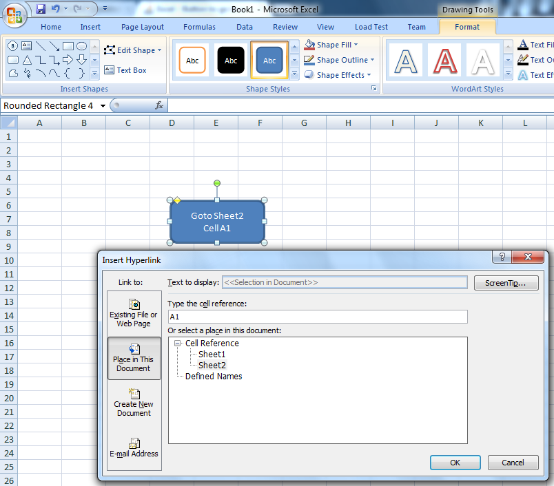 В Excel 2007, Гото вставить / форма и выбрать форму. Раскрасьте его и введите любой текст, который вы хотите. Затем щелкните правой кнопкой мыши на фигуре и вставьте гиперссылку