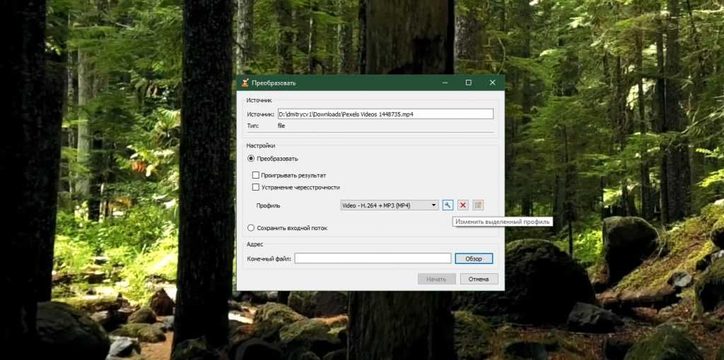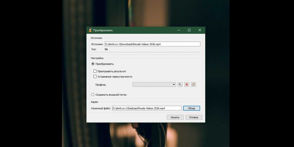 - В следующем окне оставьте пункт «Преобразовать», при желании измените параметры кодеков аудио и видео, а в поле «Адрес» укажите путь для сохранения файла итогового видео. Нажмите кнопку «Начать».
