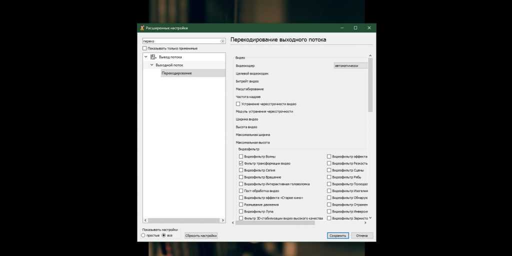 Теперь нужно перекодировать ваш видеофайл. Чтобы VLC сохранил его перевёрнутым, откройте «Инструменты» → «Настройки» и нажмите «Показывать все» внизу окна. Наберите в строке поиска «Перекодирование» и отметьте опцию «Фильтр трансформации видео». Сохраните и закройте настройки.