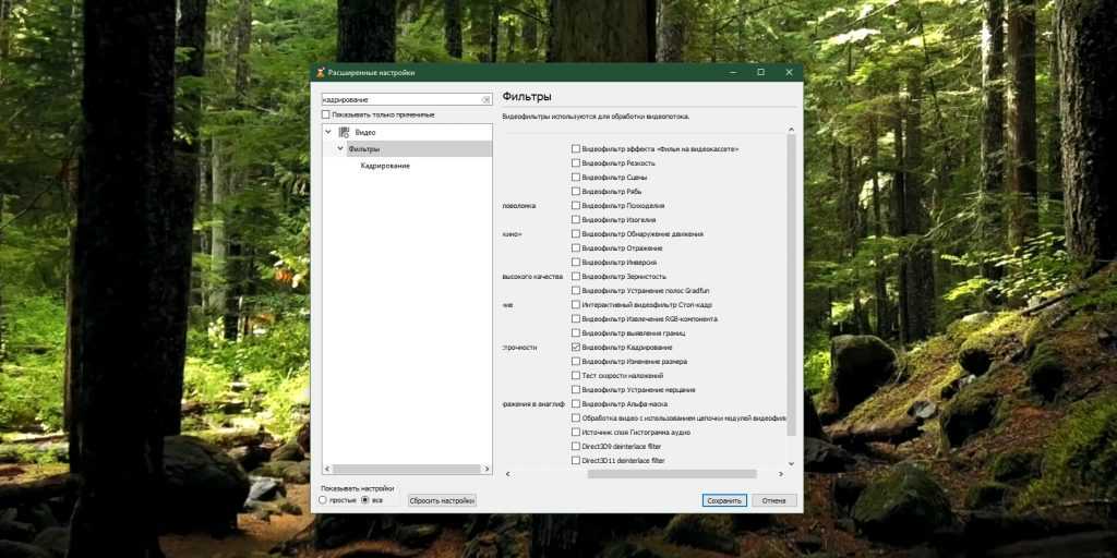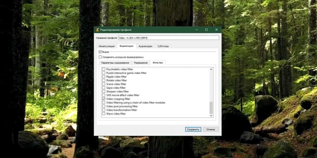 Перейдите на вкладку «Видеокодек» → «Фильтры». Активируйте опцию «Video cropping filter», нажмите «Сохранить».