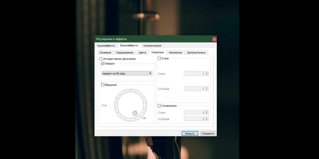 Можете выбрать опцию «Поворот» и определить, на сколько градусов повернуть видео. Или включите «Вращение» и поверните ролик с помощью движущегося деления на круге под произвольным углом. Затем нажмите «Сохранить» и «Закрыть».