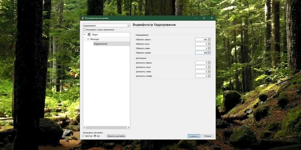 Перейдите в «Инструменты» → «Настройки», нажмите «Показывать все» внизу окна. Напишите в строке поиска «Кадрирование» и в появившемся разделе «Видеофильтр Кадрирование» укажите введённые вами цифры.