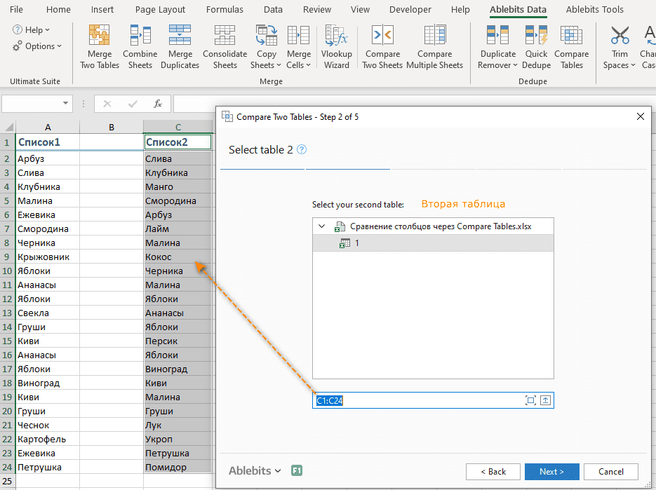 А теперь повторим все описанные выше шаги, только будем сравнивать список 2 с первым. И вот что мы в итоге получим: