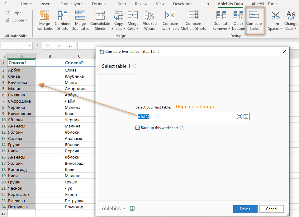 Запускаем инструмент сравнения таблиц и выбираем первый столбец. При необходимости активируем создание резервной копии листа.