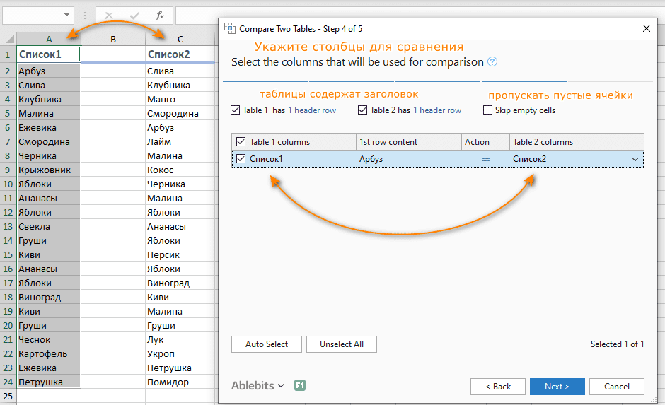 Далее указываем столбцы для сравнения. Поскольку столбцов всего два, то здесь все достаточно просто: