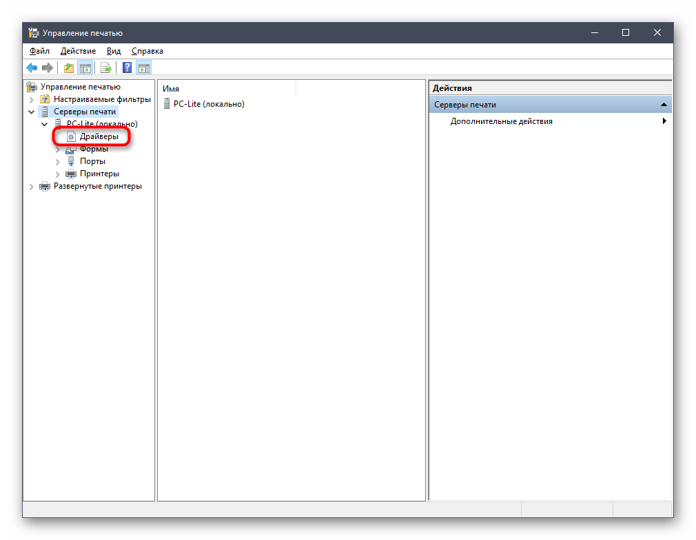 После запуска раскройте вкладку «Серверы печати», а затем – «Драйверы».