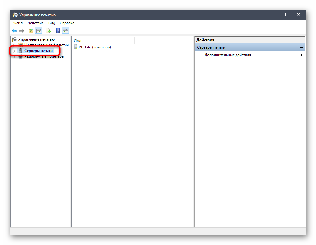 В открывшемся окне на левой панели раскройте раздел «Серверы печати».