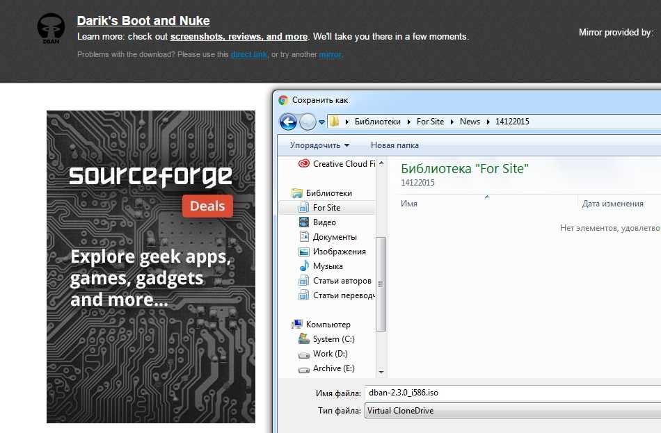 Этот образ — загрузочный. Вы должны либо записать его на CD, либо сохранить на USB-накопителе. Запись на диск в Windows 7 и 8 осуществляется просто из контекстного меню. Для этого в Проводнике нажмите на файл «Darik’s Boot and Nuke.iso» правой кнопкой мыши и выберите пункт «Записать образ диска».
