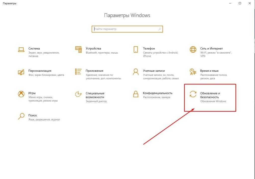 - Открываем меню «Параметры» нажатием на комбинацию Win + I, затем заходим в подраздел «Обновление и безопасность».