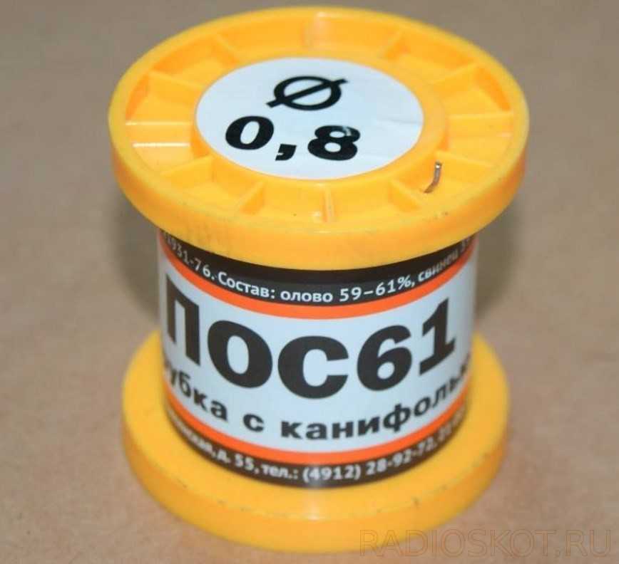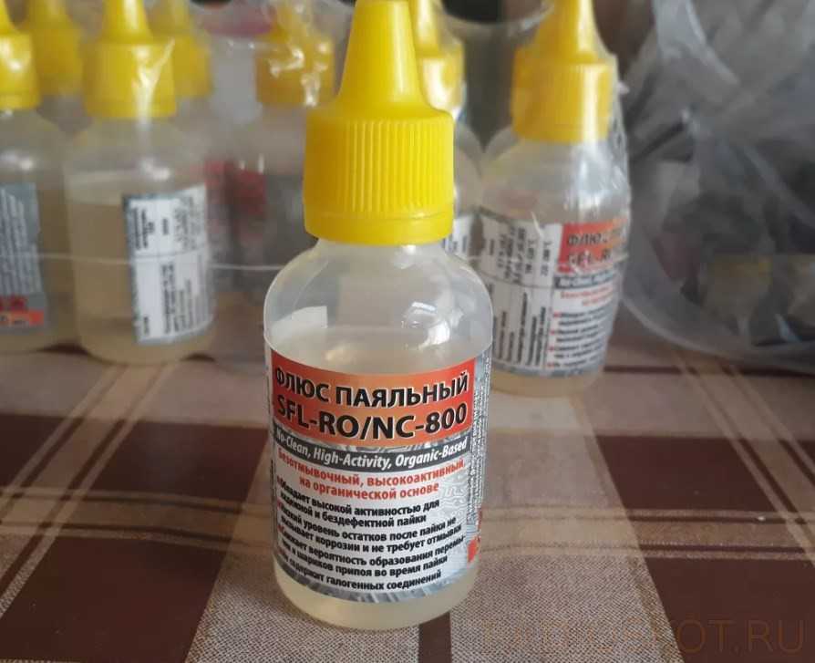 Флюс — упрощает пайку за счет удаления примесей с паяемой поверхности, облегчает плавление, увеличивает текучесть олова. Флюс, в отличие от канифоли, не оставляет коричневых следов, но остатки флюса необходимо удалить (например, ацетоном), поскольку они могут вызвать коррозию.