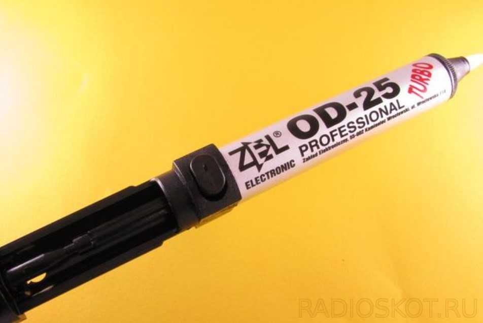 Всасывающее устройство для олова (также известное как оловоотсос или экстрактор) — используется для отсасывания излишков расплавленного припоя. Это простой шприц-инструмент, состоящий из поршня, пружины и приемника для отсасываемого припоя. Он имеет сменный всасывающий наконечник с одной стороны, ручку с другой и кнопку разблокировки сбоку.