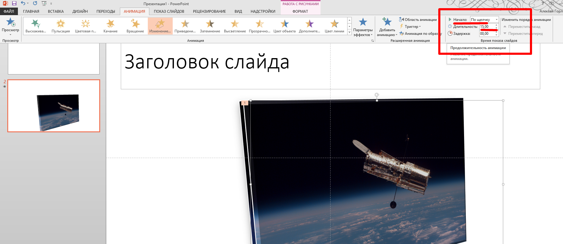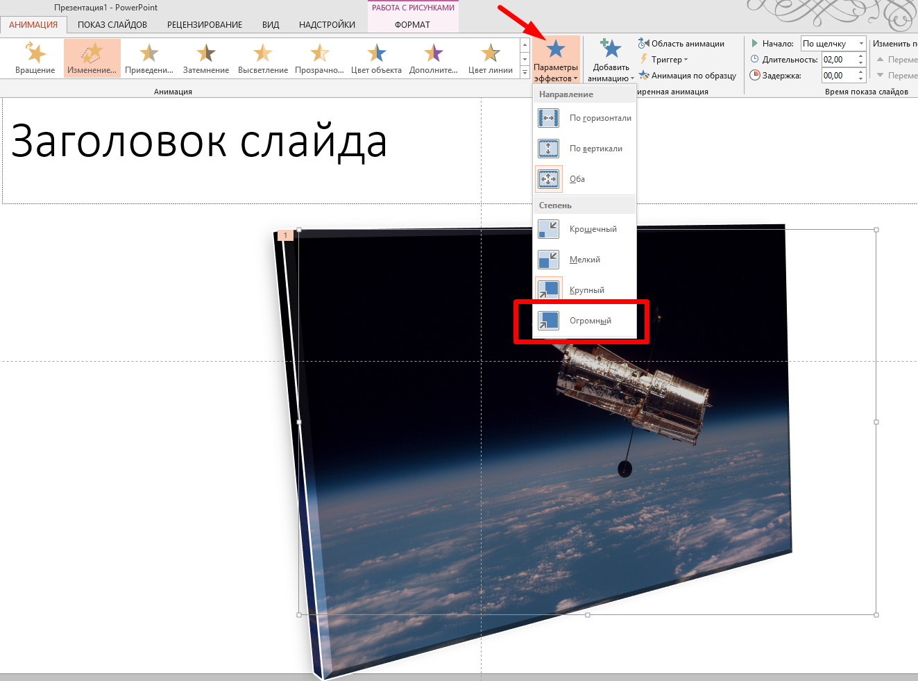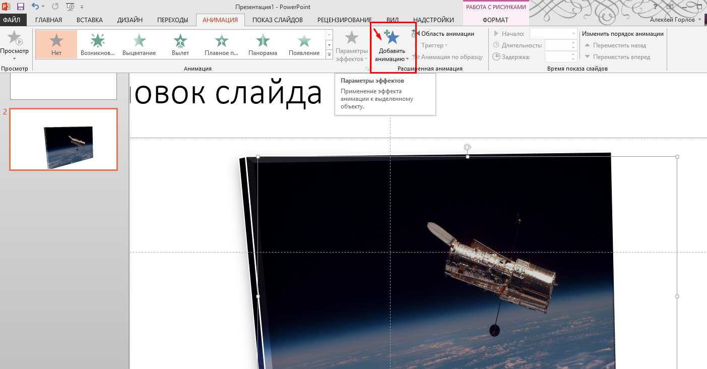 Посмотрите, как изменилось восприятие изображения. Теперь можно переходить к анимации. Опять кликаем мышью по фото, переходим на вкладку «Анимация» и нажимаем «Добавить анимацию»: