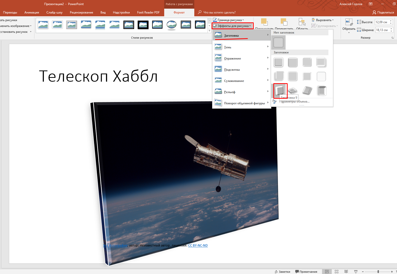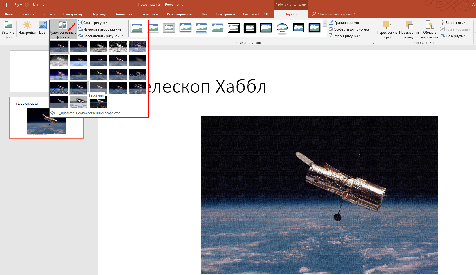 Когда изображение подгрузилось, мы попадаем во вкладку «Формат». Не стоит пренебрегать этим инструментом. Нажимаем на фото, и открываем «Формат». Можно ведь придать изображению дополнительный лоск. Например, для начала попробовать выбрать подходящий художественный эффект: