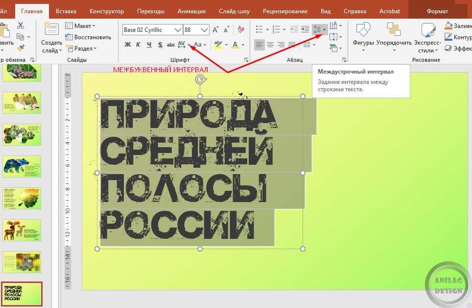 Еще нужно сделать так, чтобы буквы и строки в тексте стояли близко друг к другу. Тогда картинка будет выглядеть более целостной. Для этого, зайдя во вкладку Главная, в опции Межбуквенный интервал, регулируем расстояние между буквами. А в опции Межстрочный интервал регулируем расстояние между строками.