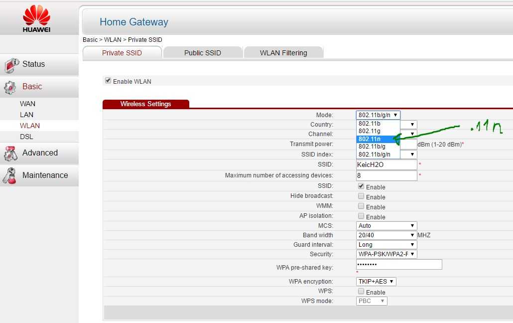 Установите правильный режим работы WiFi. Многие устанавливают в настройках смешанный вариант подключения — 802.11 b/g/n. Как результат, при наличии дома оборудования, поддерживающего G стандарт, скорость режется. Во избежание таких проблем желательно подключать оборудование, поддерживающее один стандарт, к примеру, N. При этом установки на маршрутизаторе должны быть соответствующие.