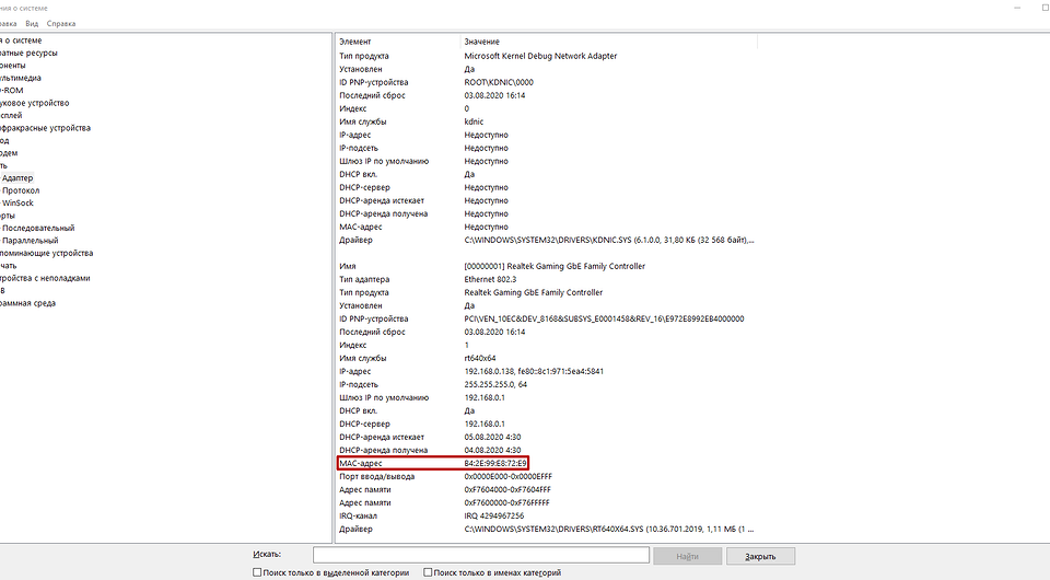 Левая сторона окна, которое откроется после нажатия ОК, будет состоять из различных пунктов, где требуется нажать на «Компоненты» и выбрать «Сеть». После этого нужно выбрать «Адаптер» и найти графу «МАК-адрес». Система отобразит искомую информацию и множество других данных.
