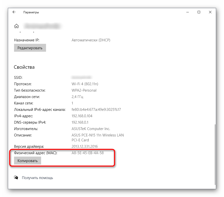 Обратите внимание, что, помимо информации о MAC-адресе, для Wi-Fi адаптера присутствуют другие сетевые данные (IP-адрес, адрес шлюза, DNS серверы и так далее)