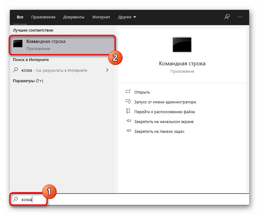 - Откройте «Пуск» и запустите оттуда «Командную строку», например, отыскав приложение через поиск.