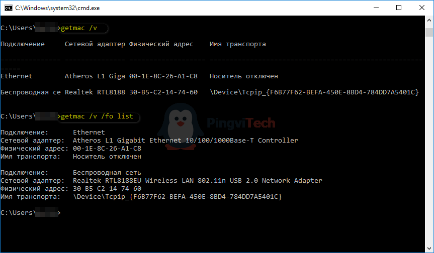 getmac — покажет информацию о MAC-адресе для всех физических устройств компьютера. По моему скромному мнению является предпочтительной, потому что не усложняет жизнь пользователю лишней информацией.