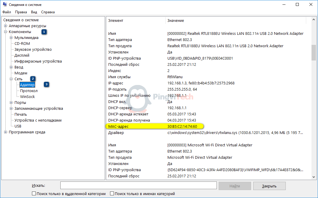 В левой части появившегося окна развернуть пункт «Компоненты» (нажатием «плюсика» или двойным щелчком), выбрать «Сеть», далее «Адаптер», и в правой части окна отыскать графу «MAC-адрес».