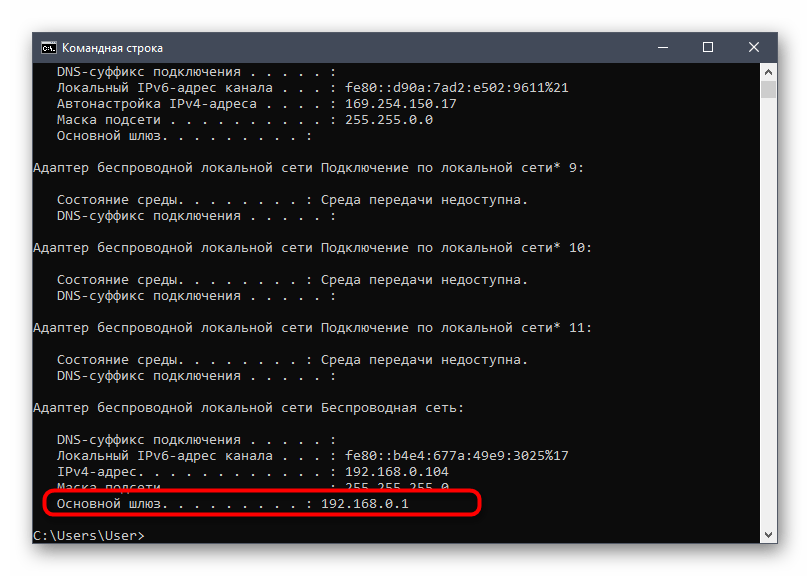 Через несколько секунд на экране появится общая карта сети, где нужно найти основной шлюз. Это IP-адрес роутера, который мы и будет использовать для получения MAC в дальнейшем. Есть и другие возможные варианты определения этого IP. Детальнее о них читайте далее.