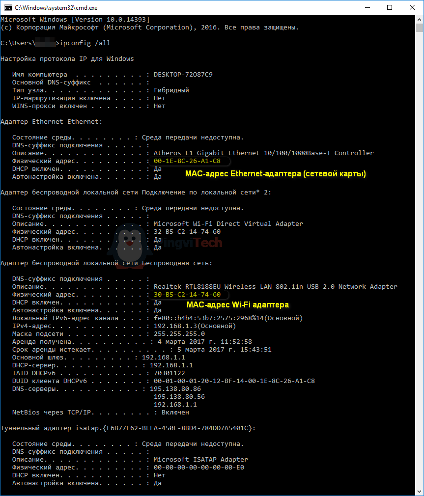 ipconfig /all — покажет детальную информацию обо всех физических и виртуальных сетевых устройствах, используемых в компьютере. В моем случае система определила сразу два MAC-адреса: физический адрес стандартного Ethernet-порта (для сетевого кабеля) и Wi-Fi адаптера, который используется для доступа к сети (не люблю я все эти кабели, знаете ли!)