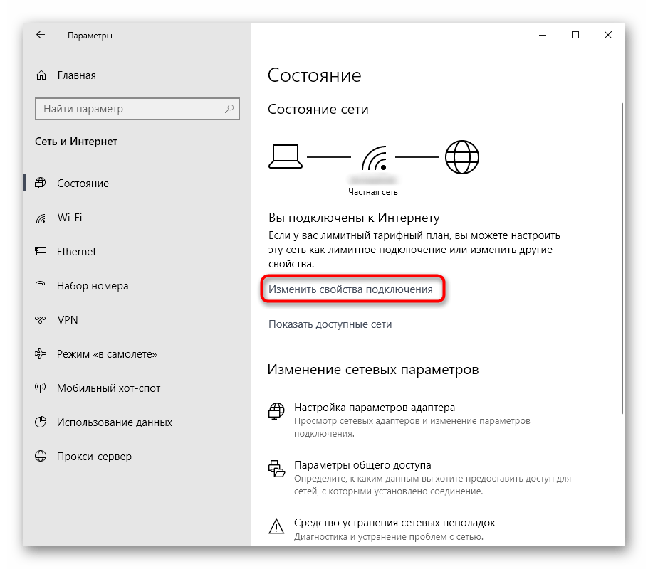 - Нажать на пункт «Изменение параметров адаптера», где находится ярлык «Подключение по локальной сети» или «Беспроводная сеть».