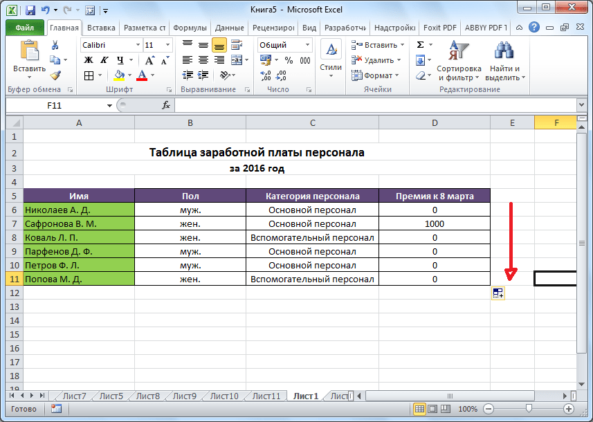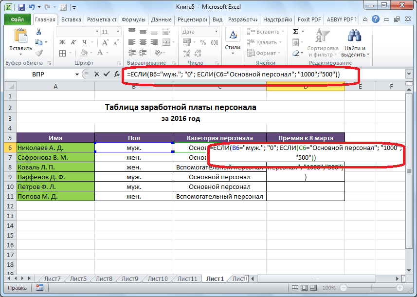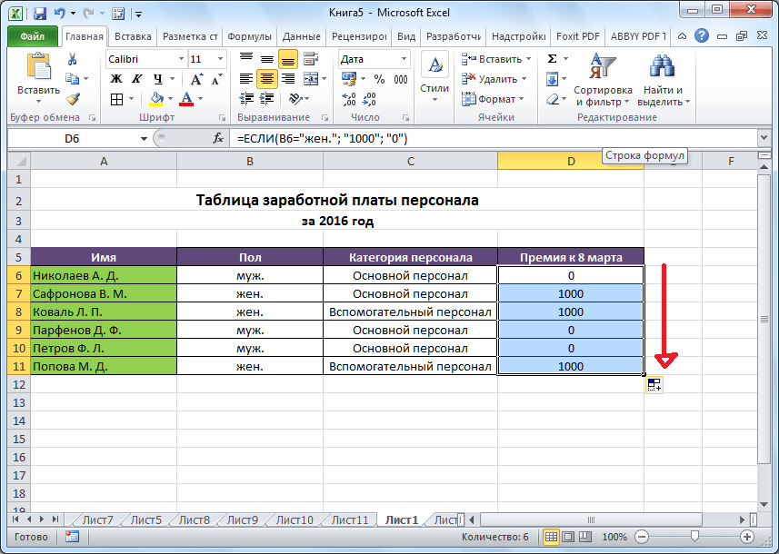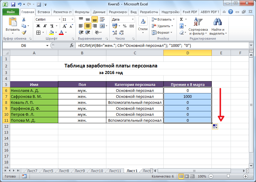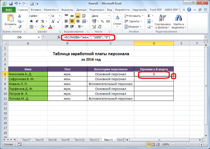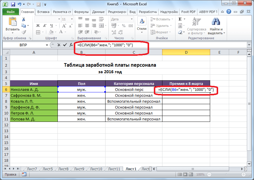 - Итак, предположим, что премия к 8 марта в 1000 рублей положена только женщинам, которые входят в число основного персонала. В этом случае, если работник — мужчина или относится к вспомогательному персоналу, то величина его премии будет равна нулю, а иначе – 1000 рублей. В виде формулы это выглядит так: «=ЕСЛИ(ИЛИ(B6=”муж.”; C6=”Вспомогательный персонал”); “0”; “1000”)» . Записываем ее в соответствующую ячейку таблицы.