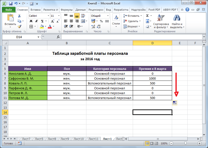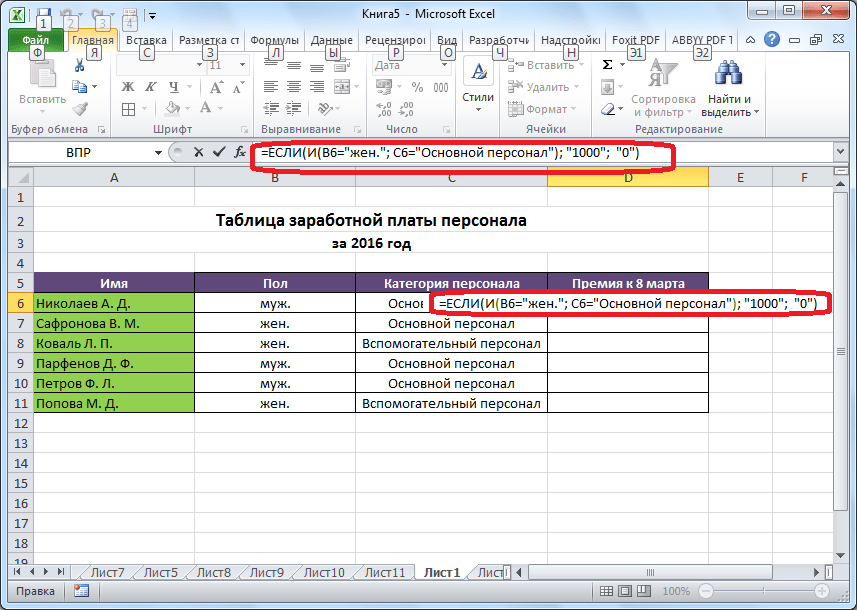 - Например, в нашей ситуации премия к 8 марта в размере 1000 рублей выдается только женщинам, которые являются основным персоналом, а мужчины и представительницы женского пола, числящиеся вспомогательным персоналом, не получают ничего. Таким образом, чтобы значение в ячейках колонки «Премия к 8 марта» было 1000, нужно соблюдение двух условий: пол – женский, категория персонала – основной персонал. Во всех остальных случаях значение в этих ячейках будет рано нулю. Это записывается следующей формулой: «=ЕСЛИ(И(B6=”жен.”; C6=”Основной персонал”); “1000”; “0”)» . Вставляем ее в ячейку.