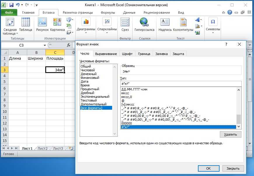 Скопируйте м2 в буфер обмена. Откройте диалоговое окно, нажав комбинацию клавиш + . При необходимости перейдите на вкладку «Число». В поле «Числовые форматы» щелкните на варианте «(все форматы)», а затем в поле «Тип» вставьте из буфера обмена значение м2. Перед ним поставьте значок # (он обозначает любую вводимую цифру), а м2 возьмите в кавычки.