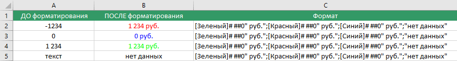 Формат положительных значений ; отрицательных ; нулевых ; текстовых