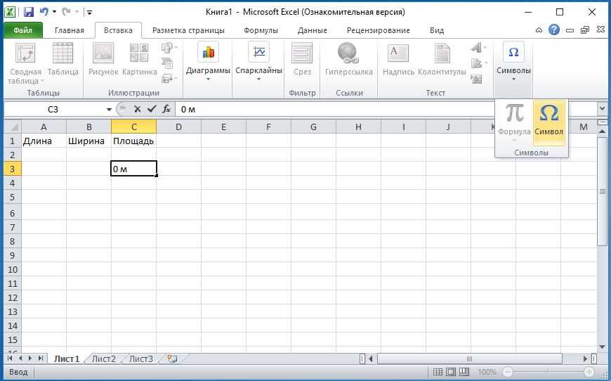 Выделите ячейку, в которой предполагается вводить значения площади. Введите значение 0 м. После буквы вставьте специальный символ 2, выбрав его из таблицы символов. Для этого в верхнем меню перейдите на вкладку «Вставка» и нажмите на кнопку «Символы». Найдите 2 в верхнем регистре и нажмите «Вставить», закройте таблицу символов.