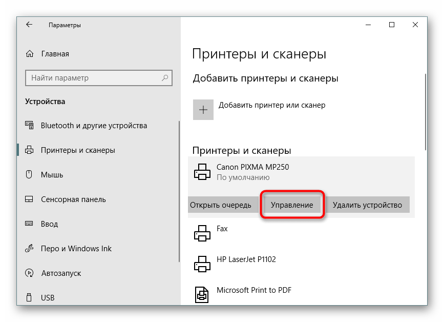 снимок экрана как открыть свойства принтера через кнопку «Управление»