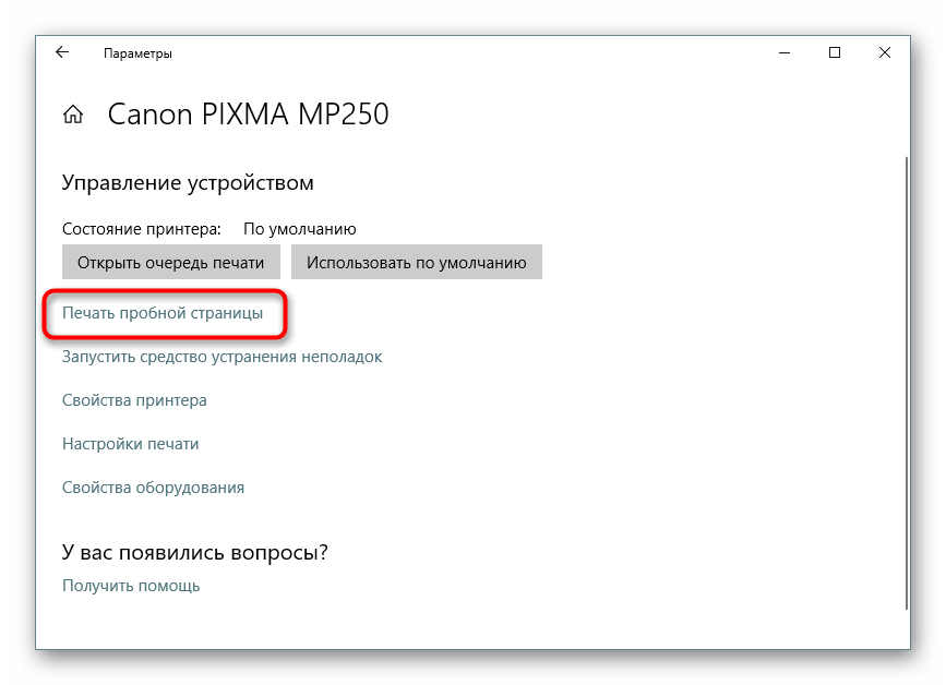 Во вкладке «Общие» вы найдете кнопку «Пробная печать», которая запустит тестовую страницу.