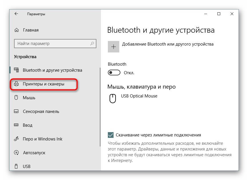 Через левую панель переместитесь в категорию «Принтеры и сканеры».
