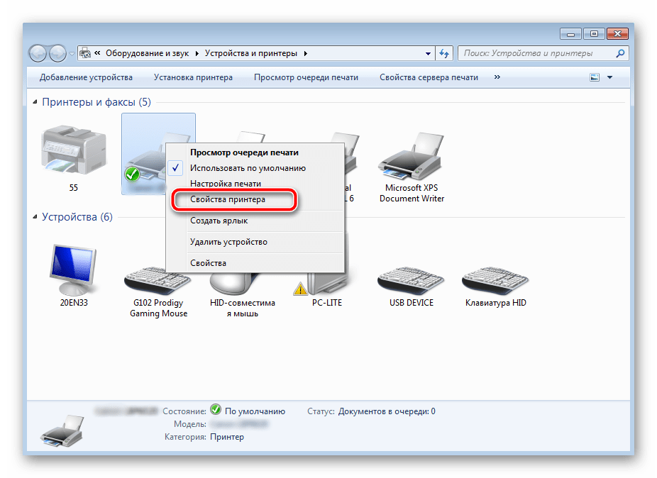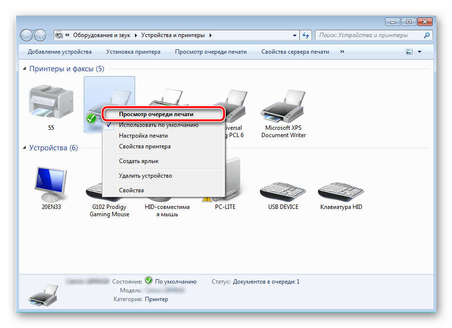 - Снова перейдите в «Устройства и принтеры», где правым кликом мыши на активном оборудовании выберите пункт «Просмотр очереди печати».