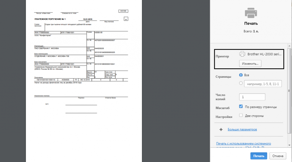 Еще один вариант ошибки — сохранение документа в формате PDF, а не вывод на печать, при работе в браузере. Такая ошибка может возникнуть при отсутствии подключения принтера. Для исправления проблемы, требуется изменить настройки в браузере перейдя в раздел «Печать» или «Предварительный просмотр», далее в «Изменить» и указать нужный принтер. Пример на рисунке №16.