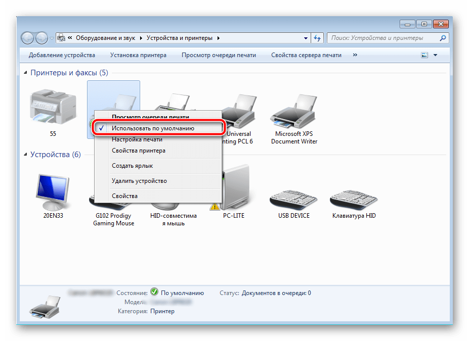 - Не выбран по умолчанию нужный аппарат. Проверьте, чтобы Ваше устройство в панели управления в разделе с принтерами был отмечен зеленой пометкой. Это значит, что он выбран основным и все задания печати будут идти на него.