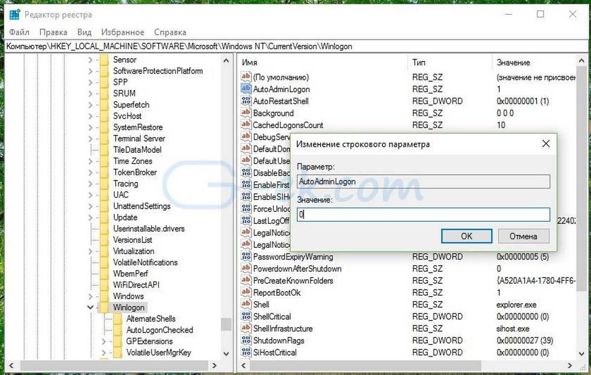 Настройка Автоматического входа в Windows 10 с помощью редактора реестра