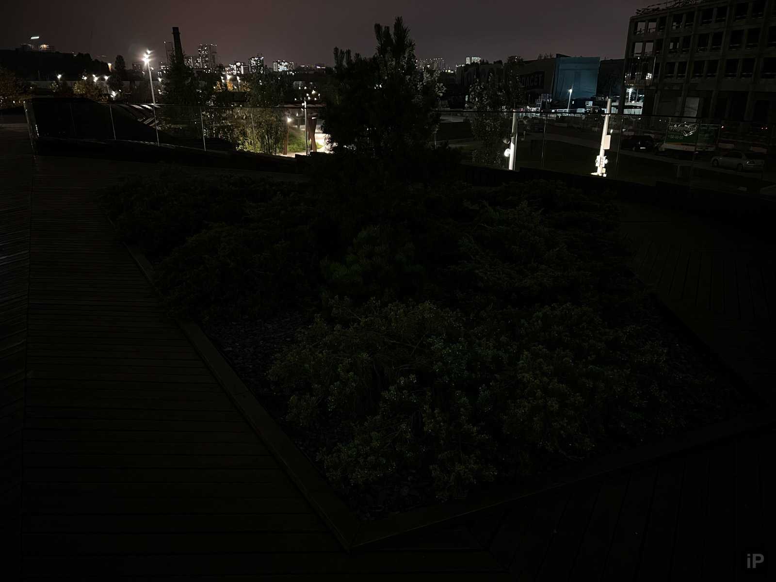 В ночи у айфона на этой камере очень сильно видны шумы, тёмные объекты сливаются в кашу.