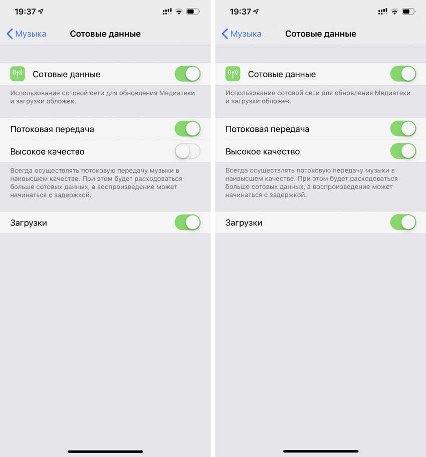 По умолчанию в меню «Настройки» > «Музыка» > «Сотовые данные» пункт «Высокое качество» отключен. Это дает возможность слушать музыку из Apple Music даже в условиях нестабильного мобильного интернета и расходовать минимальное количество трафика.