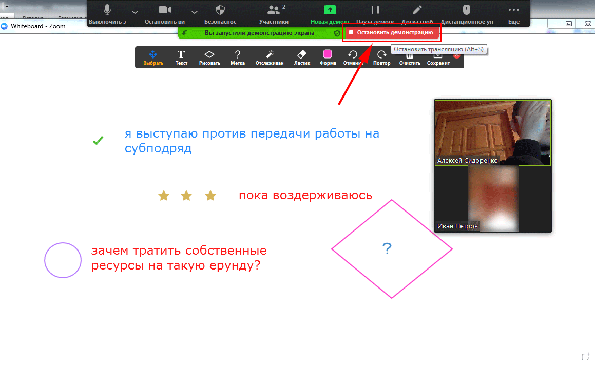 4. Для прекращения режима демонстрации экрана щелкните по красной кнопке «Остановить демонстрацию».