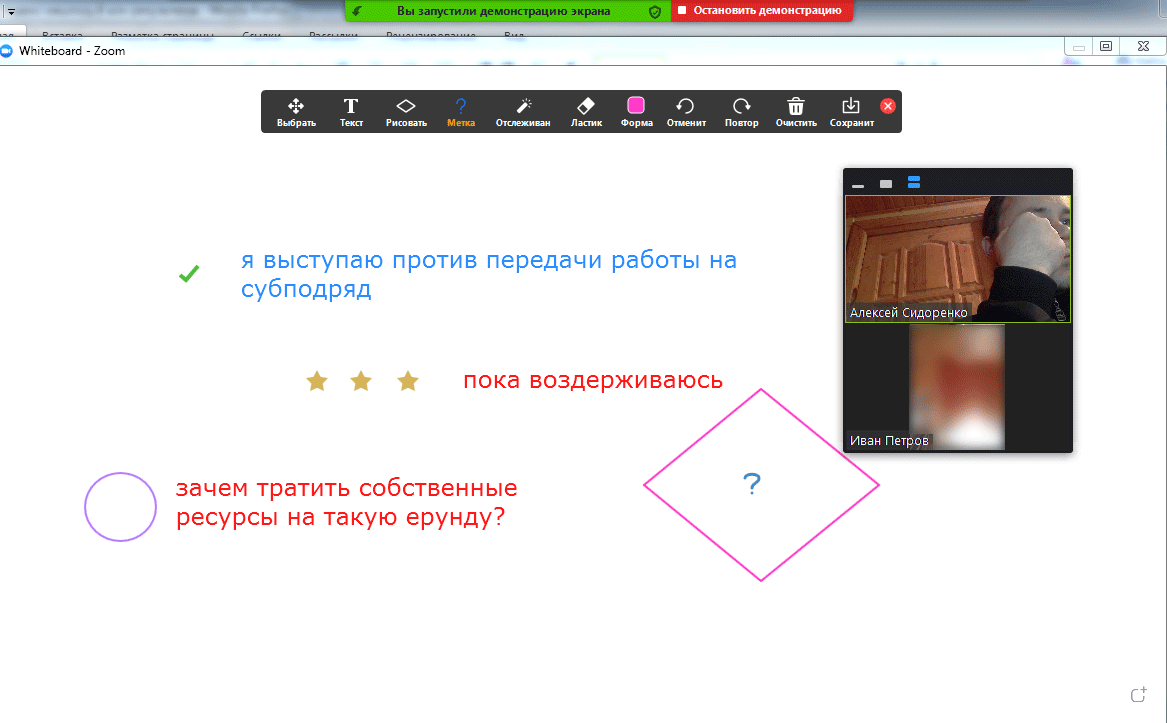 Режим «Доска сообщений» позволяет участником совместными усилиями создавать текстово-графический контент и сохранять документ на компьютере. Для сохранения виртуальной доски жмите на крайнюю справа иконку «Сохранить».